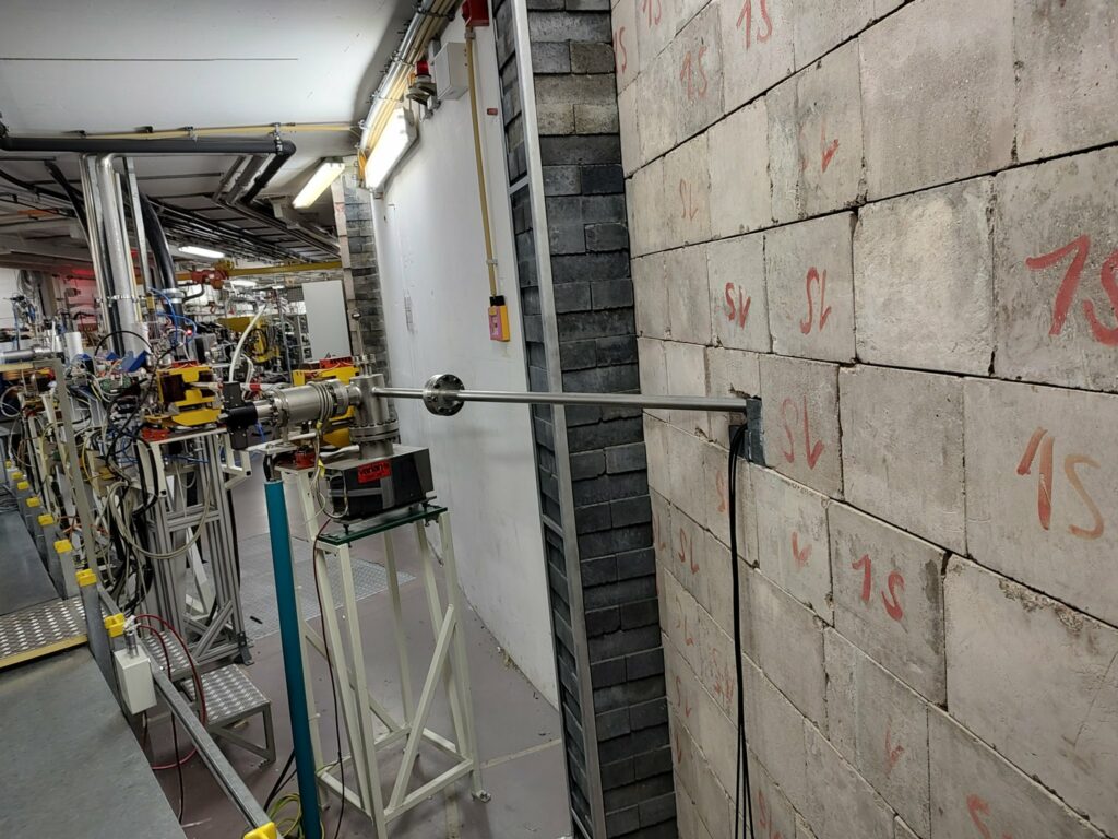 Ein Blick in die Versuchshalle. Oben Links kommt das Strahlrohr an und landet im Experimentenaufbau
