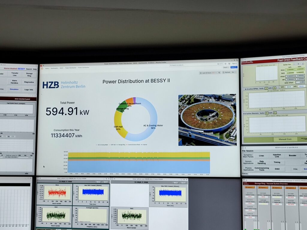Ein Blick auf die Monitore in der Steuerzentrale. Knapp 600kW im Shutdown Betrieb. Der Speicherring verbraucht im Betrieb über 2MW.